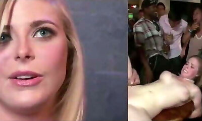 Delightful blonde honey is sucking many black cocks, one after the other and eating some new cum