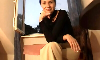 Skinny Black-haired Takes Off Dress Pants To Show Bald Snatch Thru Black Pantyhose