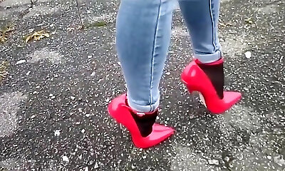 DGB07 - SISSY PUBLIC RED HIGH HEELS - RED HIGH High-heeled Slippers - SISSY