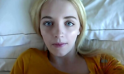мастурбирующая пепельная блондинка в очках глотает сперму после минета от первого лица