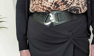 иду на работу в блузке, юбке, чулках и на каблуках. готова к тому, что мой молодой босс осмотрит мои зрелые сиськи, задницу и лысую пизду